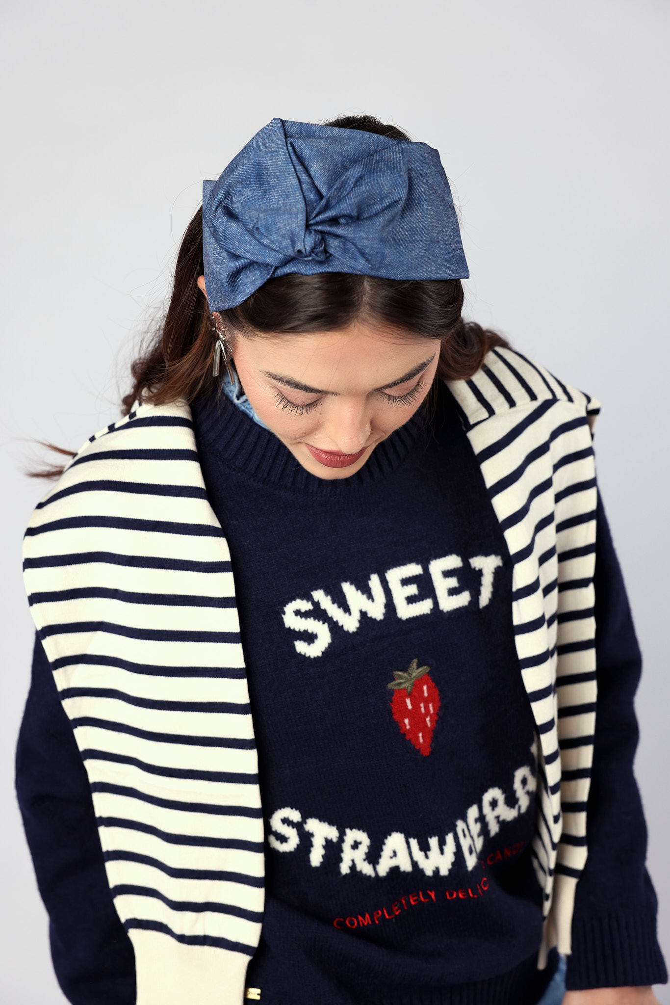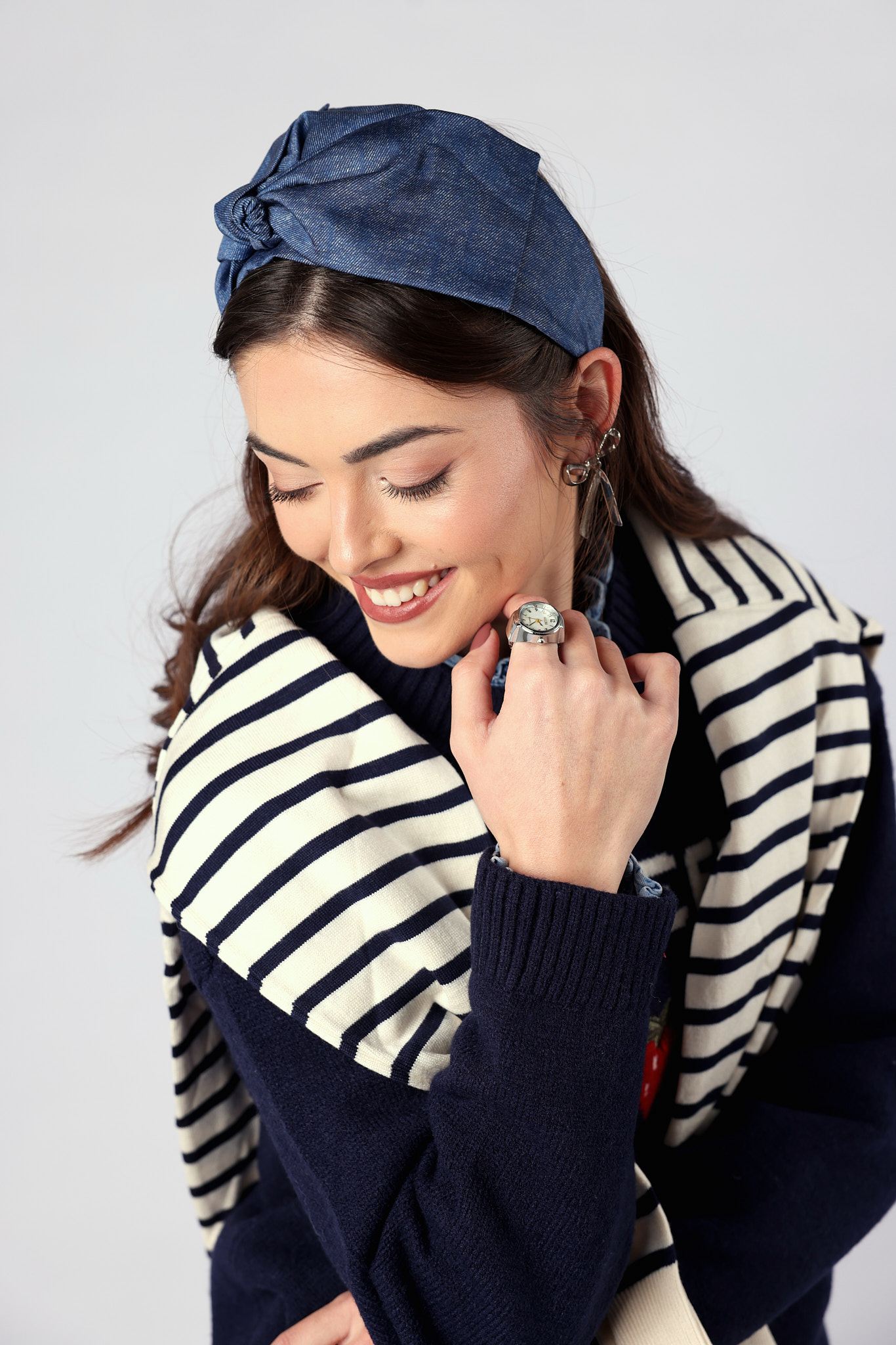 עיצוב פפיון מבד ג׳ינס בגימור מחוספס אך אלגנטי, משולב על סרט או קשת ליצירת מראה ייחודי ושיקי.