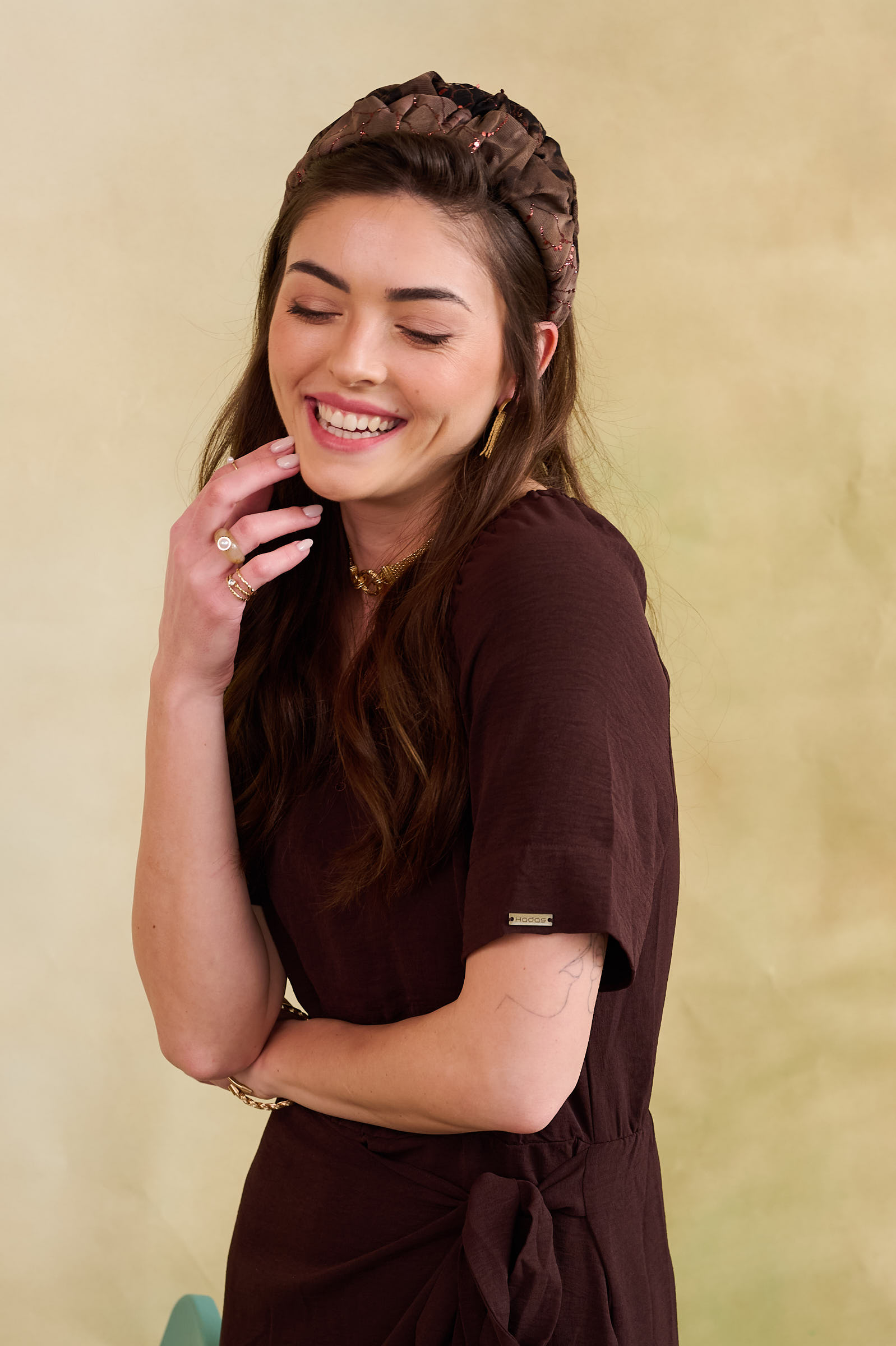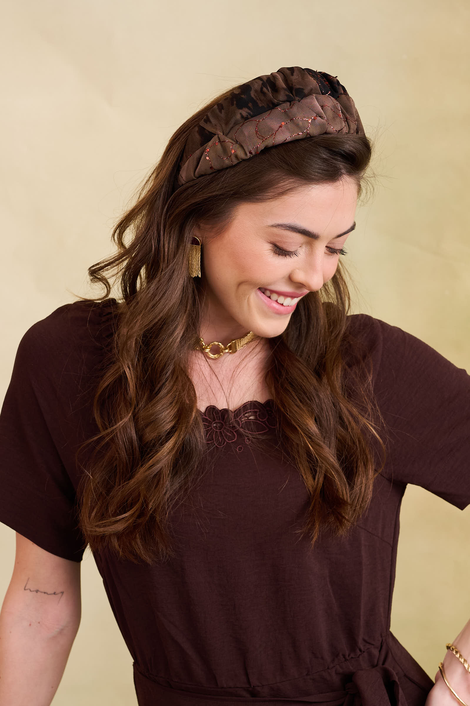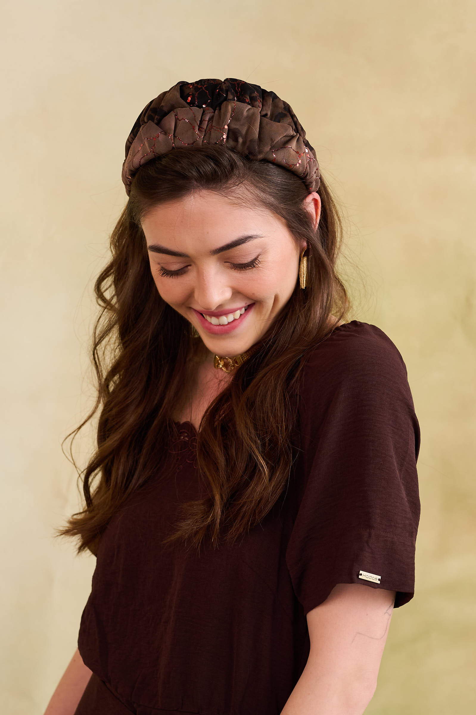 סוג הבד: טול רך בגווני חום ושחור עם נצנץ רוז גולד